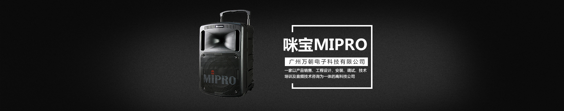 廣州萬朝電子科技有限公司成立于2008年,公司主要是一家以產品銷售、工程設計、安裝、調試、技術培訓及音頻技術咨詢?yōu)橐惑w的高科技公司。主要代理銷售產品包括:咪寶MIPRO,舒爾SHURE,森海塞爾SENNHEISER,BOSE專業音箱,JBL系列音箱,皇冠CROWN功放,QSC功放,聲藝SOUNDCRAFT調音臺,雅馬哈YAMAHA,DBX及AKG等周邊器材。